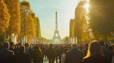 A vibrant view of people walking in the sunlight towards the iconic Eiffel Tower, surrounded by colorful trees and a festive atmosphere.