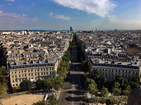 PARIS, FRANCE - JULY 06, 2016 : Beautiful panoramic view of Paris from the roof of the Triumphal Arch. Champs Elysees.