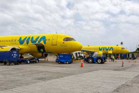 San Andres, Colombia - April 8, 2022: Vivaair Airbus A320neo airplanes at San Andres (ADZ) airport in Colombia.