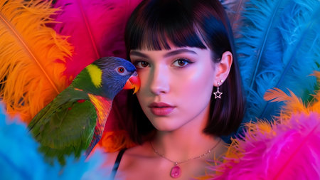 A portrait of a woman with a parrot, surrounded by colorful feathers.