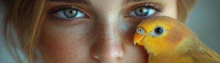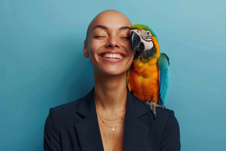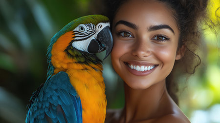 Smiling woman holding a colorful parrot, vibrant feathers and joyful expression