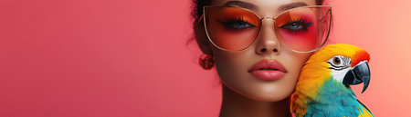 Futuristic woman with bold makeup and colorful parrot in metallic tropical fashion scene