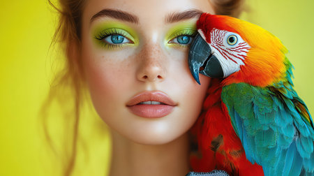 Woman in green with parrot, matching vivid makeup, lime background, stylish harmony