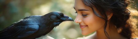 A serene young woman with long, flowing hair stands gracefully, her eyes closed, as black birds swirl around her, creating a captivating scene. This artistic image symbolizes freedom and introspection, blending human beauty with the essence of nature.