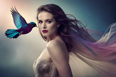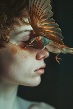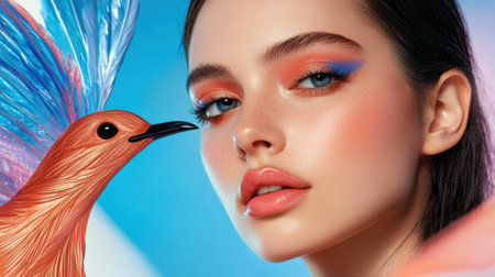A stunning beauty portrait showcasing creative artistic makeup, featuring vibrant colors and a whimsical bird, capturing a flawless look and imaginative expression.