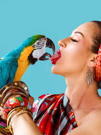 Portrait of young attractive woman in african style holding ara parrot on her hand and kissing it by tongue on blue background