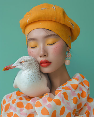 Artistic portrait of a young Asian woman with pink hair posing with a white seagull. The image embodies a surreal artistic expression with an emphasis on vibrant colors and the beauty of nature