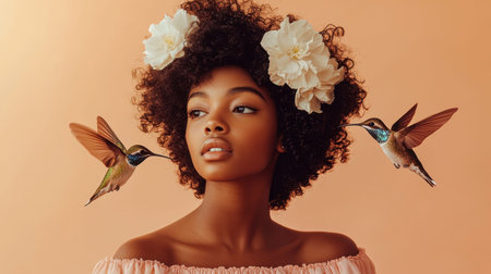 A woman poses gracefully with a floral crown on her head, surrounded by hovering hummingbirds. The warm backdrop enhances her natural beauty and the lively scene.