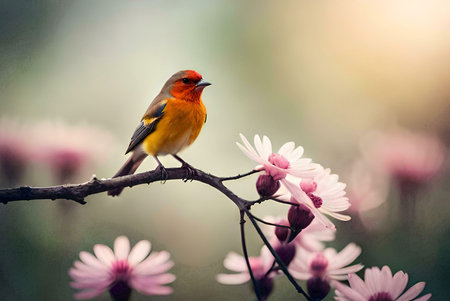 Aromatic Birds tree branch flowers. Wild bird day. Generate Ai