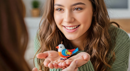 Close up portrait of a smiling young woman holding a colorful handmade felt bird ornament in warm natural light. Suitable for lifestyle, craft, holiday, and product use.