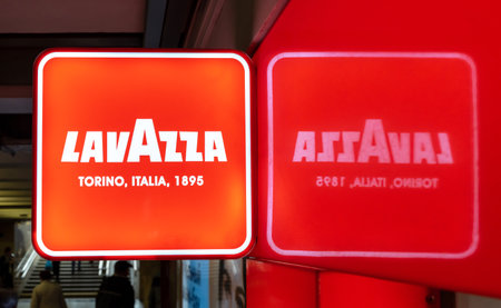 Lavazza - Сoffee shop advertising sign on the building facade. Lavazza - Italian manufacturer of coffee products. Founded in Turin in 1895 by Luigi Lavazza. Minsk, Belarus, 2022