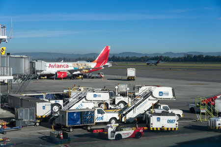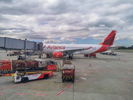Avianca airline plane preparing to leave and loading luggage at the airport in Bogota. El Dorado airport. Bogota Colombia . April 25, 2019