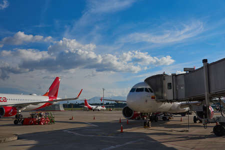 Medellin, Colombia - January 27, 2019: Avianca Airbus airplanes at Medellin Rionegro airport (MDE) in Colombia. Airbus is a European aircraft manufacturer based in Toulouse, France.