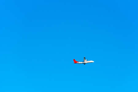 The plane flies in the sky in clear weather. Airplane in the sky. Airplane before landing. The plane is flying. Russia, St. Petersburg, April 27, 2018