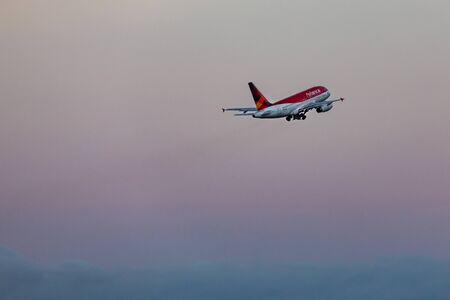 Samborondon, Ecuador; August 22 2022: Low angle shot commercial plane rising up at cloudy sky, Samborondon, Ecuador