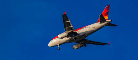 Barcelona, Spain; April 27, 2019: Airbus A320 plane of the Iberia airline, landing at the Josep Tarradellas airport in Barcelona-El Prat