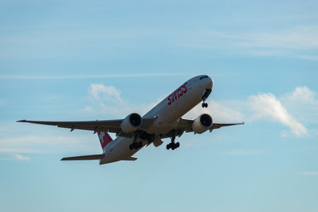 Zurich, Switzerland, January 4, 2024 HB-JNE Swiss international airlines Boeing 777-3DEER aircraft takeoff from runway 32