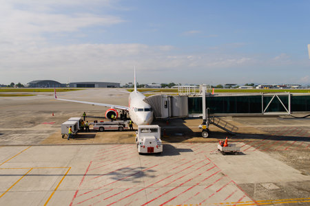 KUCHING - MAY 06: docked jet Airasia airplane on May 06, 2014 in Kuching, Malaysia. AirAsia Berhad is a Malaysian low-cost airline headquartered in Kuala Lumpur, Malaysia