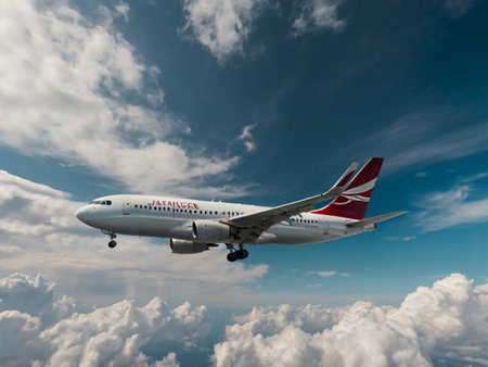 Airplane flying in the blue sky with white clouds at day time