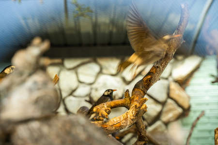 Small finch bird on a branch in a bird nursery