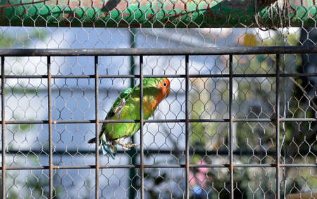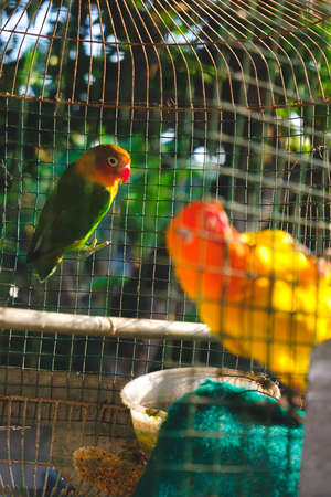 closeup of a caged lovebirds in a great cage