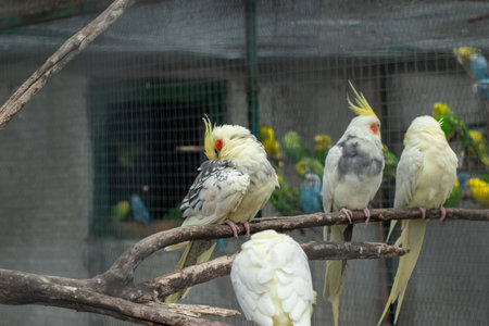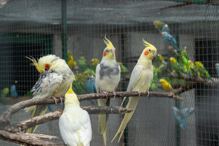 Yellow Cockatiel birds stand on the rail in the cage in Padmaja Naidu Himalayan Zoological Park at Darjeeling, India.
