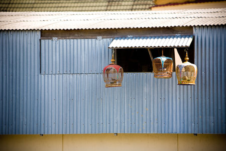 bird cages in front metal wall