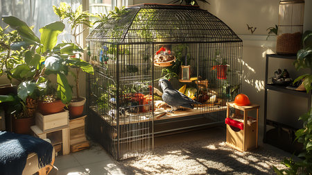A vibrant indoor scene featuring a parrot in a lush cage surrounded by green plants.