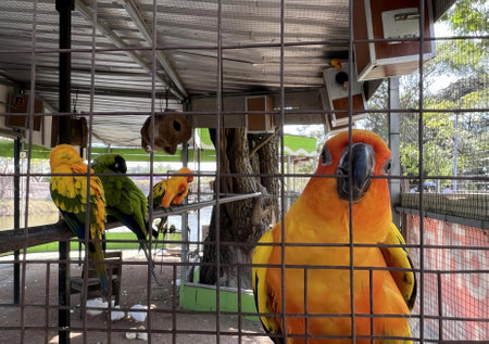 Yellow and orange parrot in a cage at public park