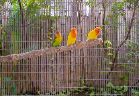 Three Lovebirds sitting on a branch in a cage in a zoo