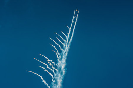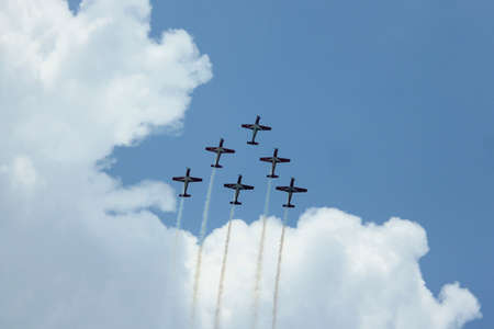 Aerobatics, air show. Aircraft team performing in the sky with white lines and blue sky