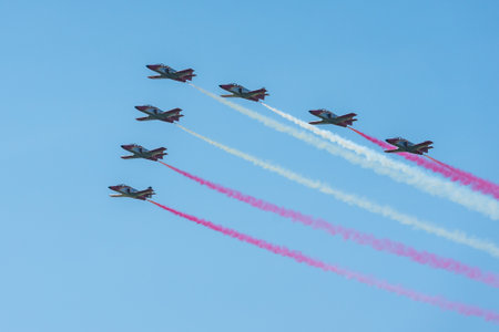 Airshow of military jet fighters. Group of military airplanes performs maneuvers with a smoke trace. Aviation background
