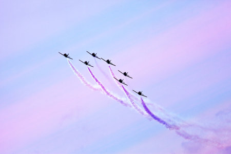 The aerobatic team of light fighters dissolves in the evening sky, leaving a smoky trail
