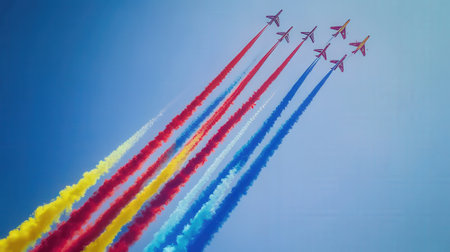 Stunt airplanes perform a dazzling display against a bright blue sky, leaving colorful smoke trails of red, yellow, and white.