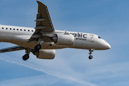 Zurich, Switzerland, February 24, 2022 Helvetic Airways Embraer E190-E2 aircraft on its final approach to runway 14