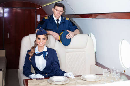 Cabin crew serving passengers inside the corporate jet. The flight attendant serves the table for those flying in business class.