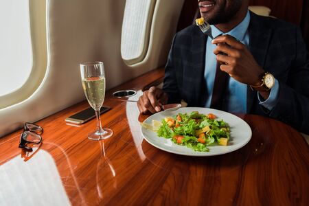 cropped view of african american businessman near tasty dishes and businesswoman in private plane