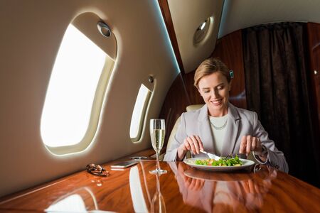 happy businesswoman holding cutlery near salad and champagne glass in private jet