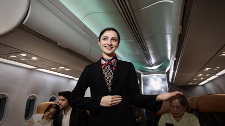 Air hostess. Smiling flight attendant in uniform welcomes and guides passengers aboard a modern airplane. Friendly airline staff providing professional service and comfortable travel flight experience
