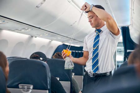 Man with oxygen mask demonstrating safety procedure prior to passenger airplane flight