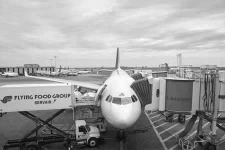 NEW YORK - APRIL 06, 2016: passenger jet airplane docked at JFK Airport. John F. Kennedy International Airport is a major international airport located in the borough of Queens in New York City, United States.