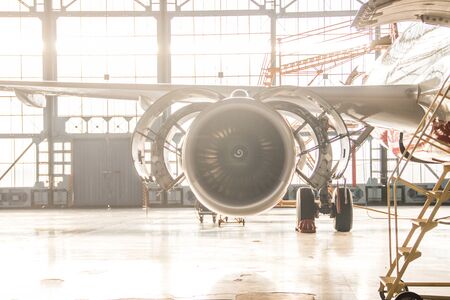 Passenger commercial airplane on maintenance of engine turbo jet and fuselage repair in airport hangar. Aircraft with open hood on the nose and engines, as well as the luggage compartment