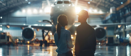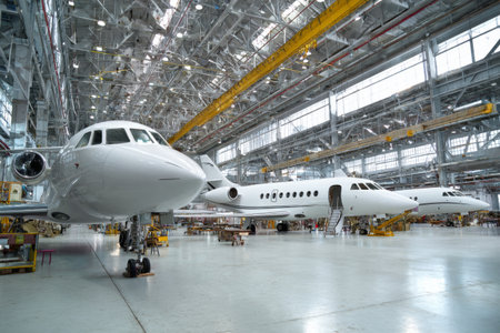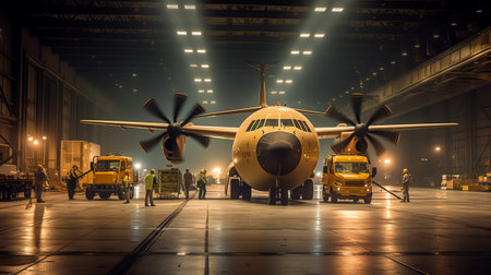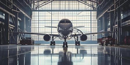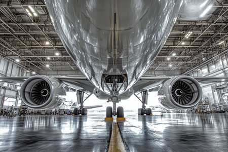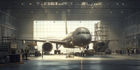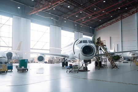 Large aircraft inside a well lit hangar during the early afternoon with a focus on engineering and maintenance activities. Generative AI