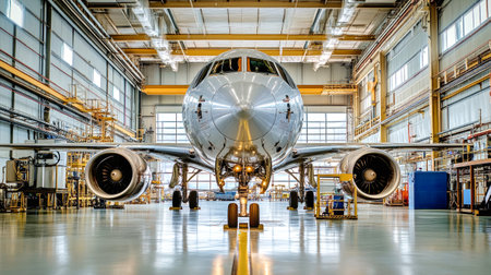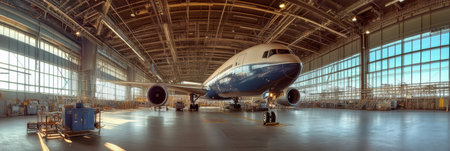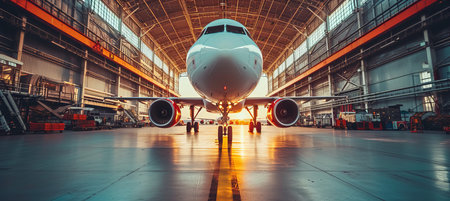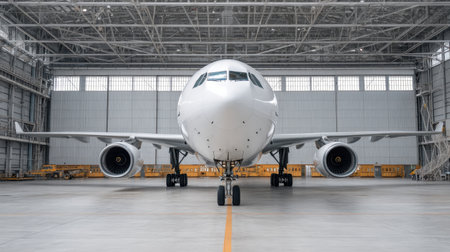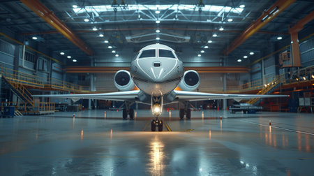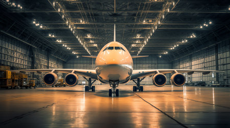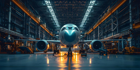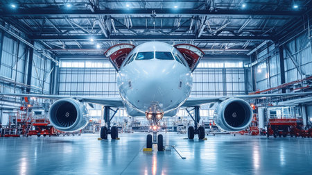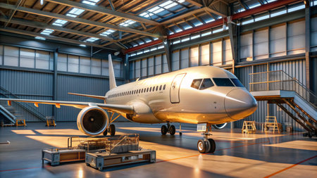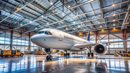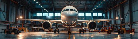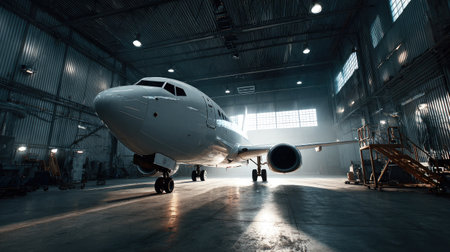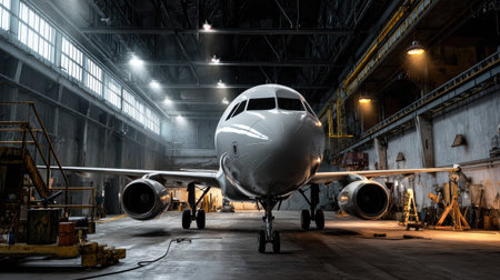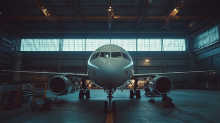 Passenger jet inside an aircraft hangar, surrounded by maintenance equipment Straighton shot with ambient lighting revealing the plane s size and precision