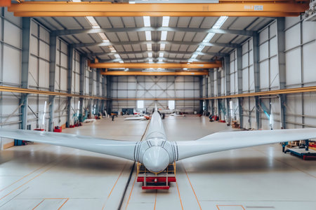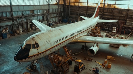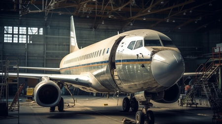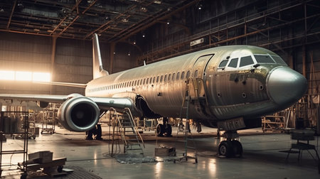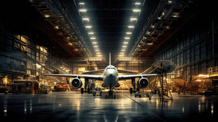 Plane Undergoing Maintenance in a Large Hangar Within an Aviation Facility Focused on Engineering and Construction Projects Generative AI