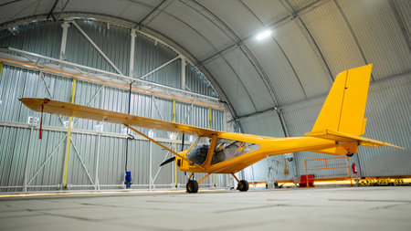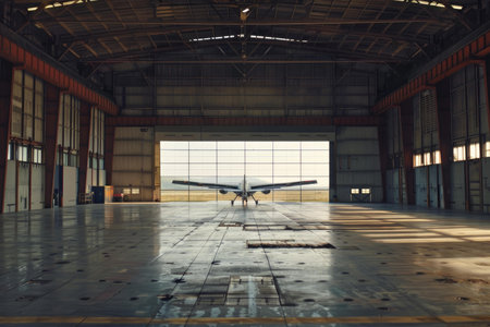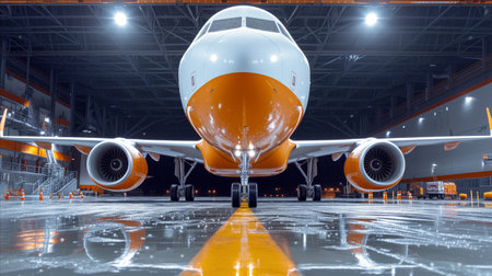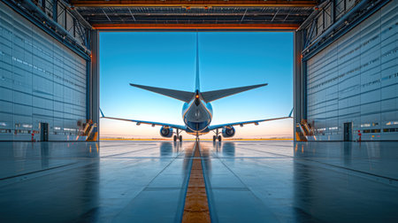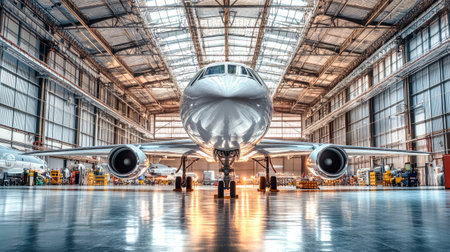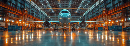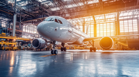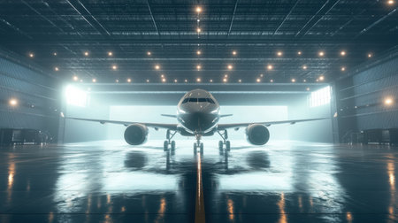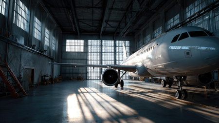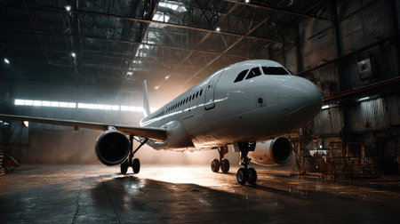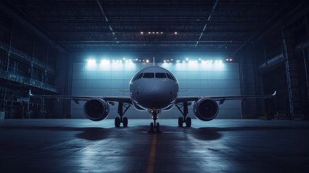 This captivating image depicts an airplane situated in a spacious industrial hangar, illuminated by dramatic lighting. The scene highlights the aircraft's sleek design and operational scale, providing insights into the aviation industry.