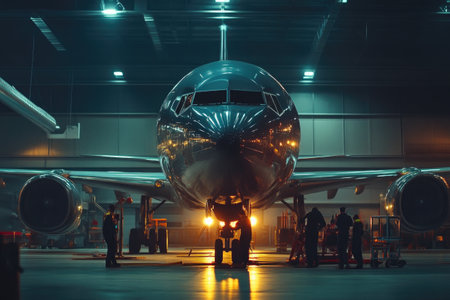 Aviation maintenance hangar, mechanics, aircraft repairs, technical expertise Generative AI