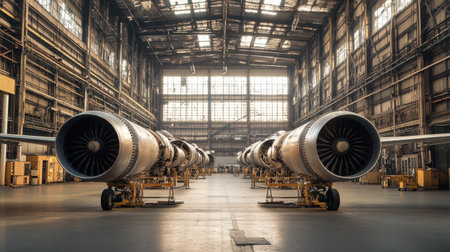 A stunning perspective of aircraft engines in a bustling manufacturing facility captures the essence of modern aviation technology and engineering processes.