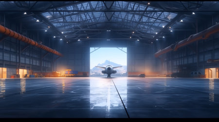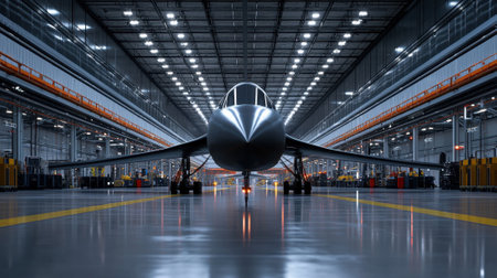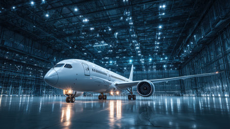 A modern aircraft stands prominently within a spacious hangar, showcasing industrial elements and dramatic lighting, ideal for themes of aviation and maintenance.