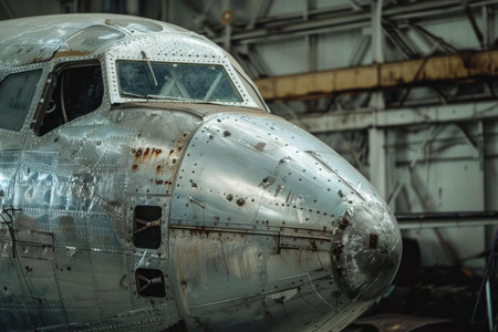 Explore an atmospheric image of an aged airplane nose resting inside a dim hangar, showcasing distressed metal textures and an industrial ambiance.